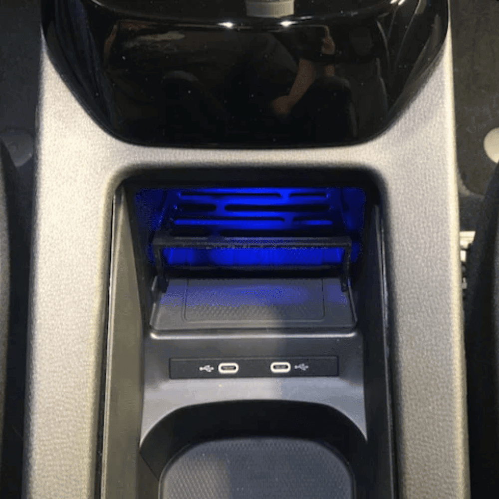 Hylden er 3D-printet i slidstærkt PLA+ eller PETG, hvilket sikrer både varmebestandighed og lang holdbarhed. Den er skræddersyet til at matche dimensionerne og stilen i VW ID.4, så den integrerer sig sømløst i kabinen. Den matte overflade og de afrundede kanter passer ind i bilens moderne design, uden at virke påklistret eller uoriginal.
